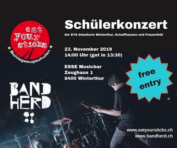 Die Schlagzeugschüler der Eat Your Sticks Standorte Winterthur, Schaffhausen und Frauenfeld lassen ab 14 Uhr die Bühne beben. 24 Schüler werden Songs quer durch die Pop und Rockgeschichte performen. In Zusammenarbeit mit der Winterthurer Musikerschmiede „Bandherd“ wurden dieses Jahr die Profimusiker Fabian Sonderegger und Peter Gasser engagiert, mit denen einige der Schüler live rocken dürfen.
