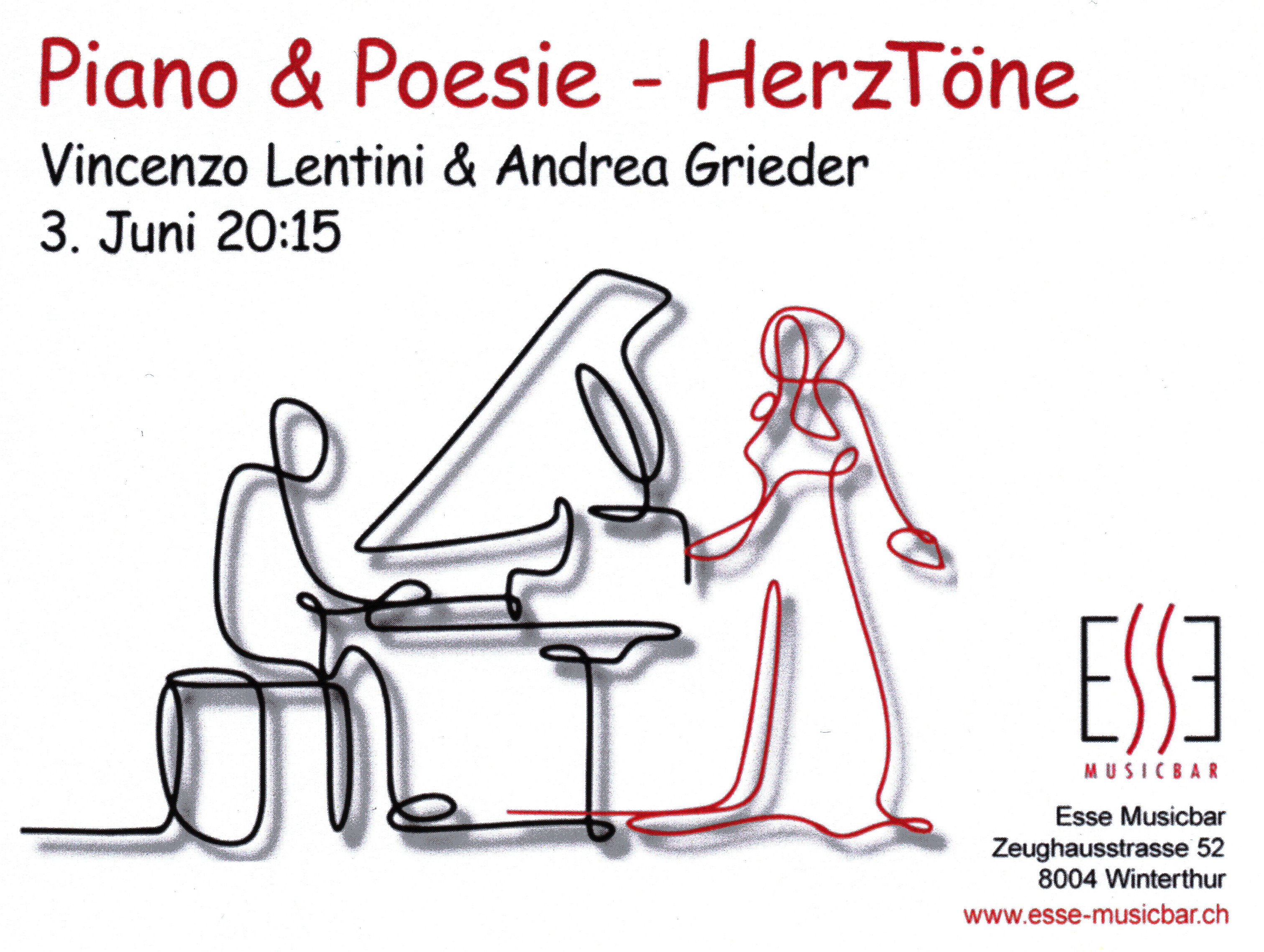 Piano & Poesie ist Musik von Vincenzo Lentini und Gedichte von Andrea Grieder. Die Klavier-Kompositionen sind inspiriert von den Gedichten, auf der Bühne treten Wort und Klang in einen Dialog. Das Programm HerzTöne spannt einen Bogen vom ersten Herzton, zum Verklingen des Herzens, und was darüber noch bleibt. HerzTöne ist Rhythmus ist Klang.